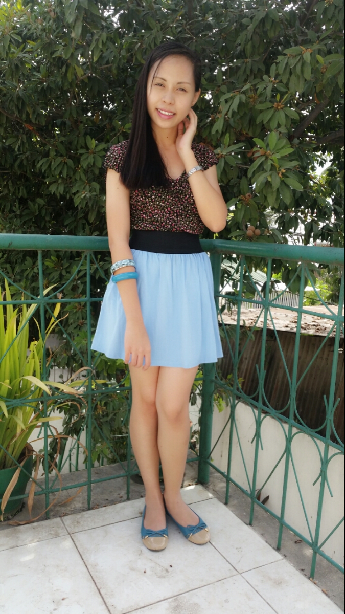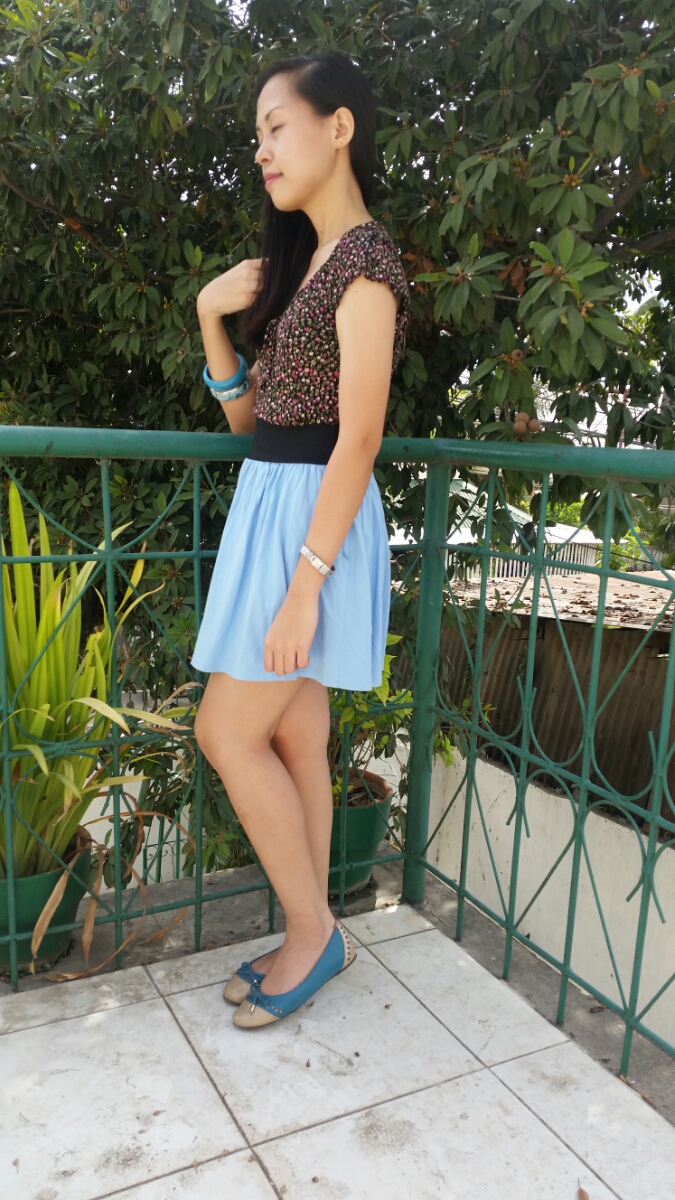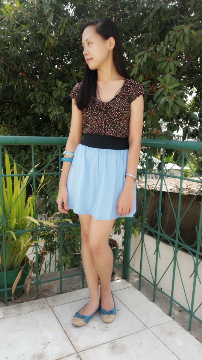 May is a much awaited month for me. During this month, there a lot of festivals about flowers, most especially what we call ”Flores de Mayo”. It is a really colorful month. To welcome the month of May, I went for something floral. Yesterday, Cinco de Mayo, I wore a floral green top from Self Esteem. I really like this brand, as per its name, it encourages you to keep your self esteem by leaving a note on its tag. The note says: Be true to yourself and maintain your self esteem. I think it’s cute. I paired the top with a blue skater skirt and finished it off with blue ballet flats. What do you think?