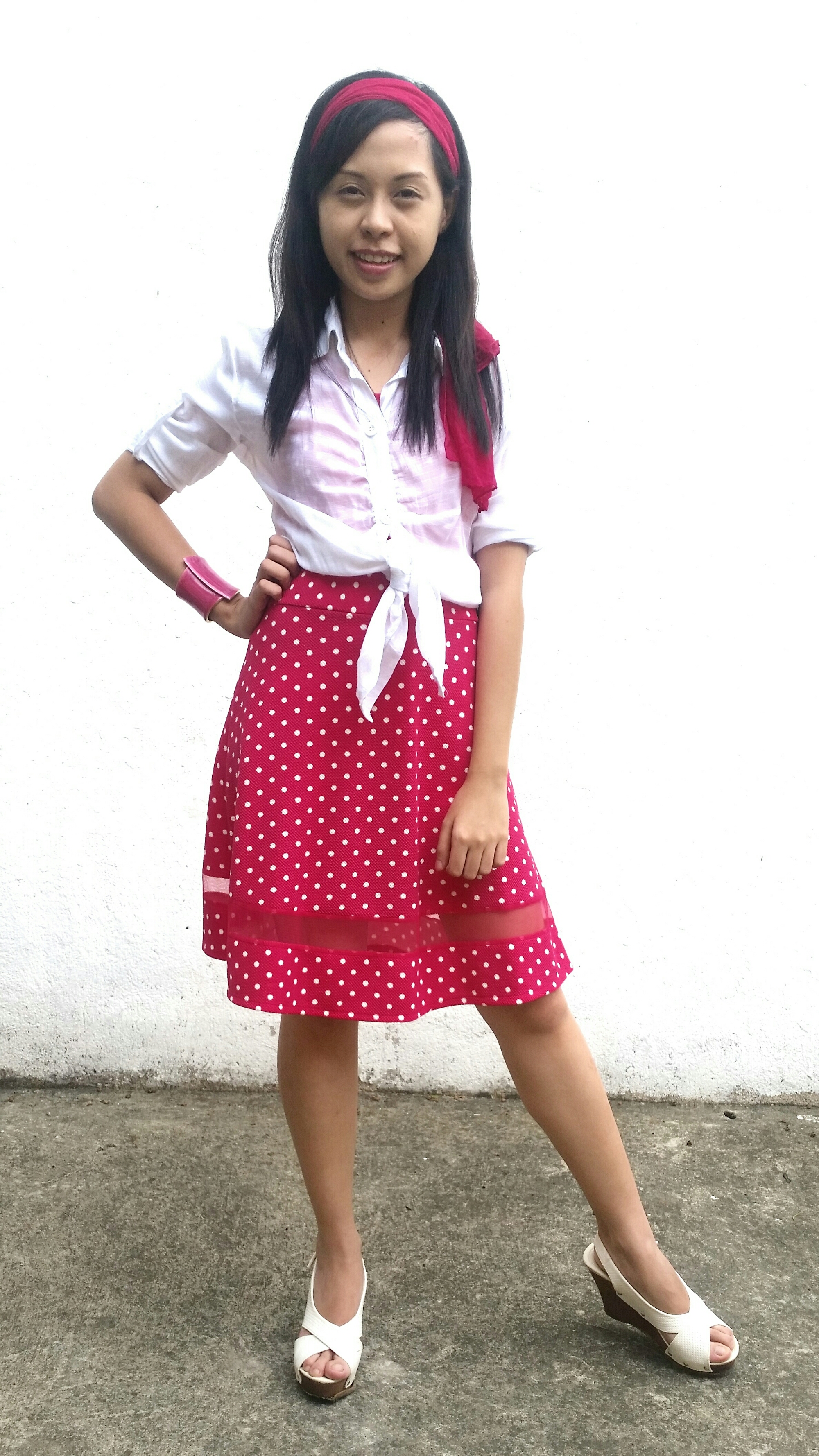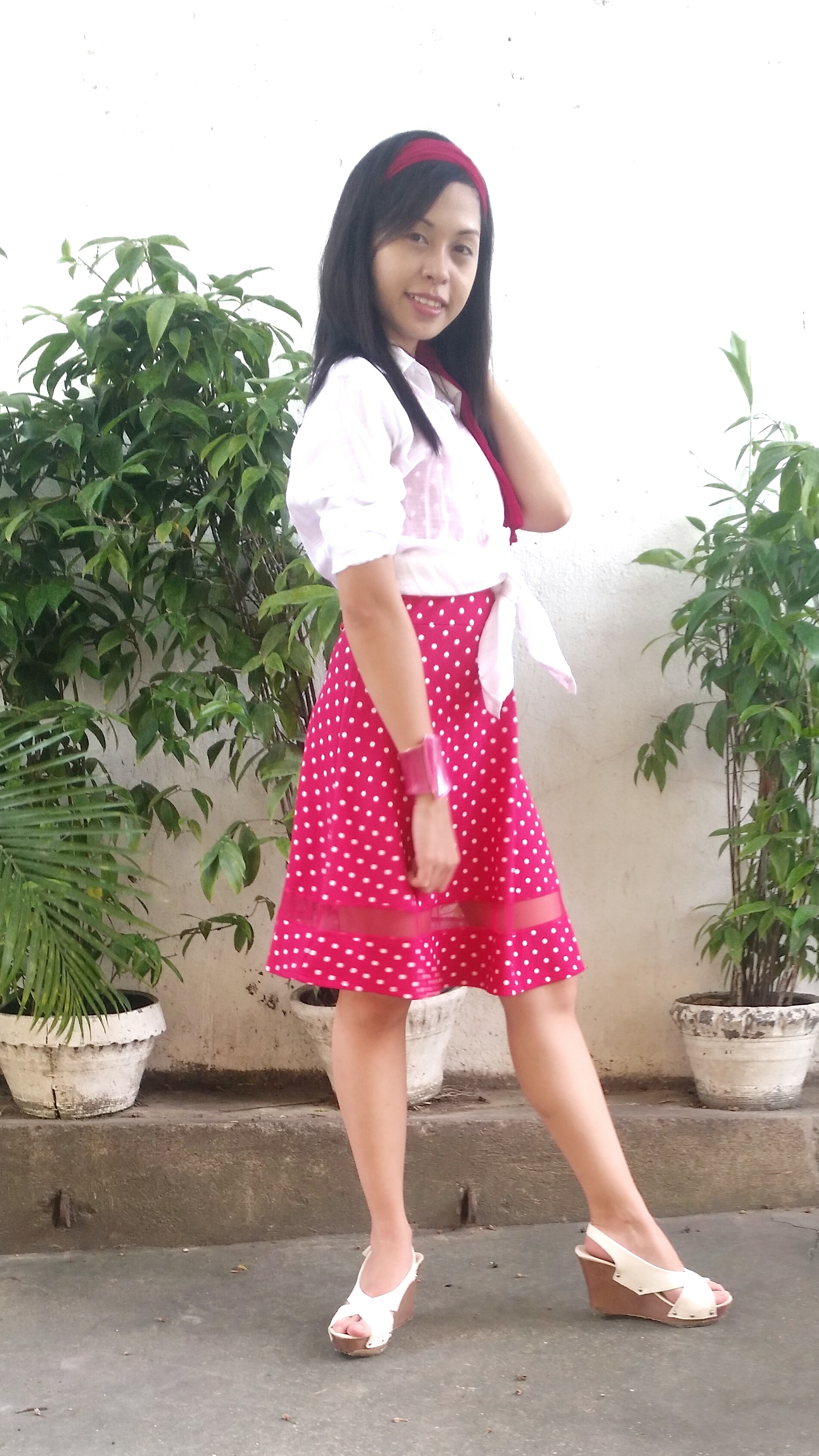 So for that one special day, for a house party my mom has hosted with a retro-ish theme, I chose to wear this Hot Pink Polka dotted Dress covered with a White Button Down on top and paired it with my White Wedges. I also chose this hot pink scarf as accessory and used it as a headband, in honor of National Breast Cancer Awareness Month.