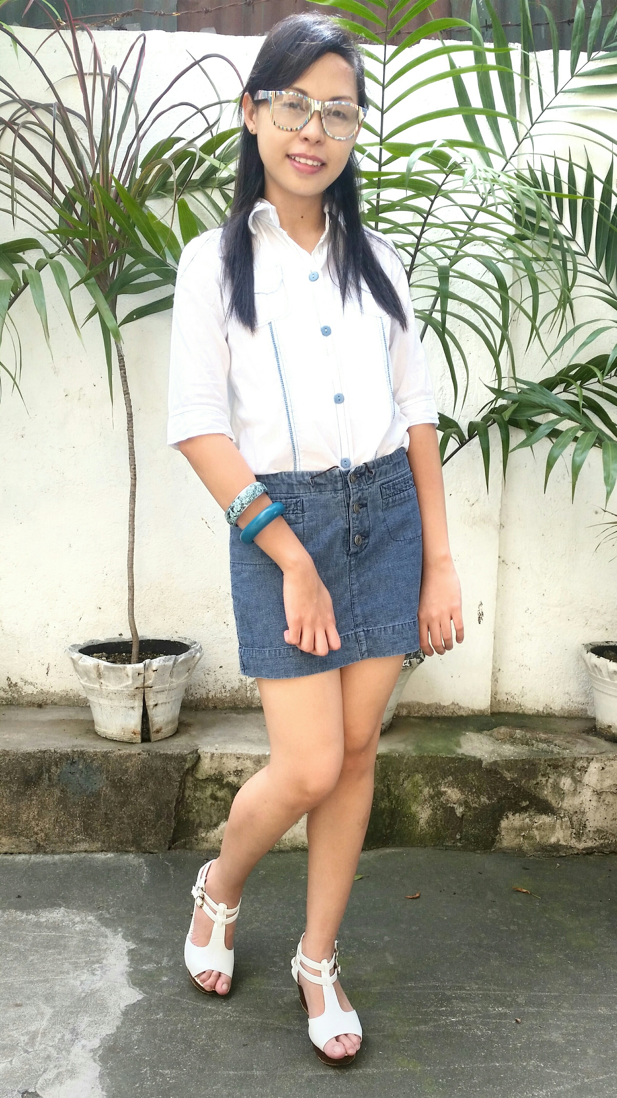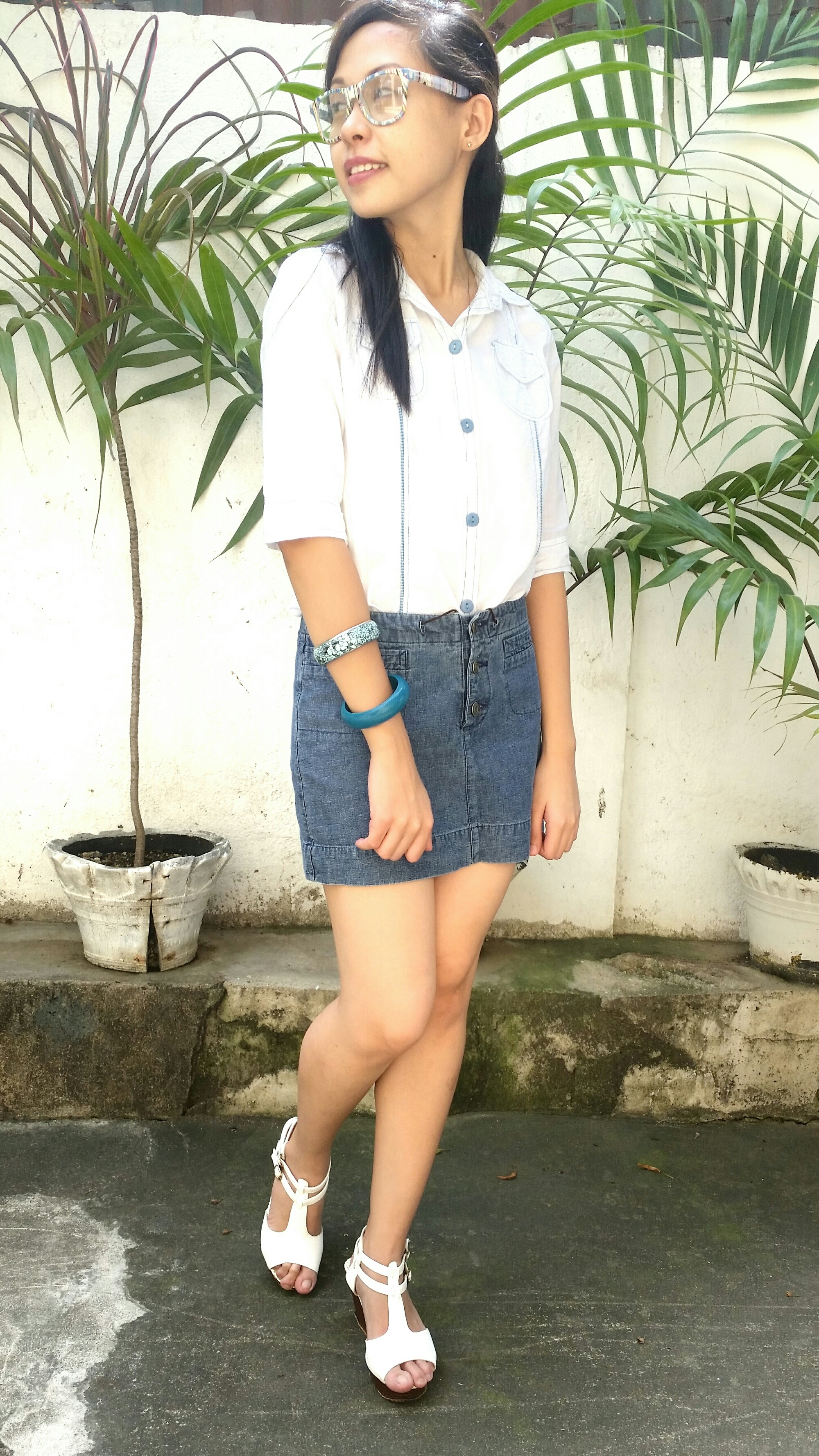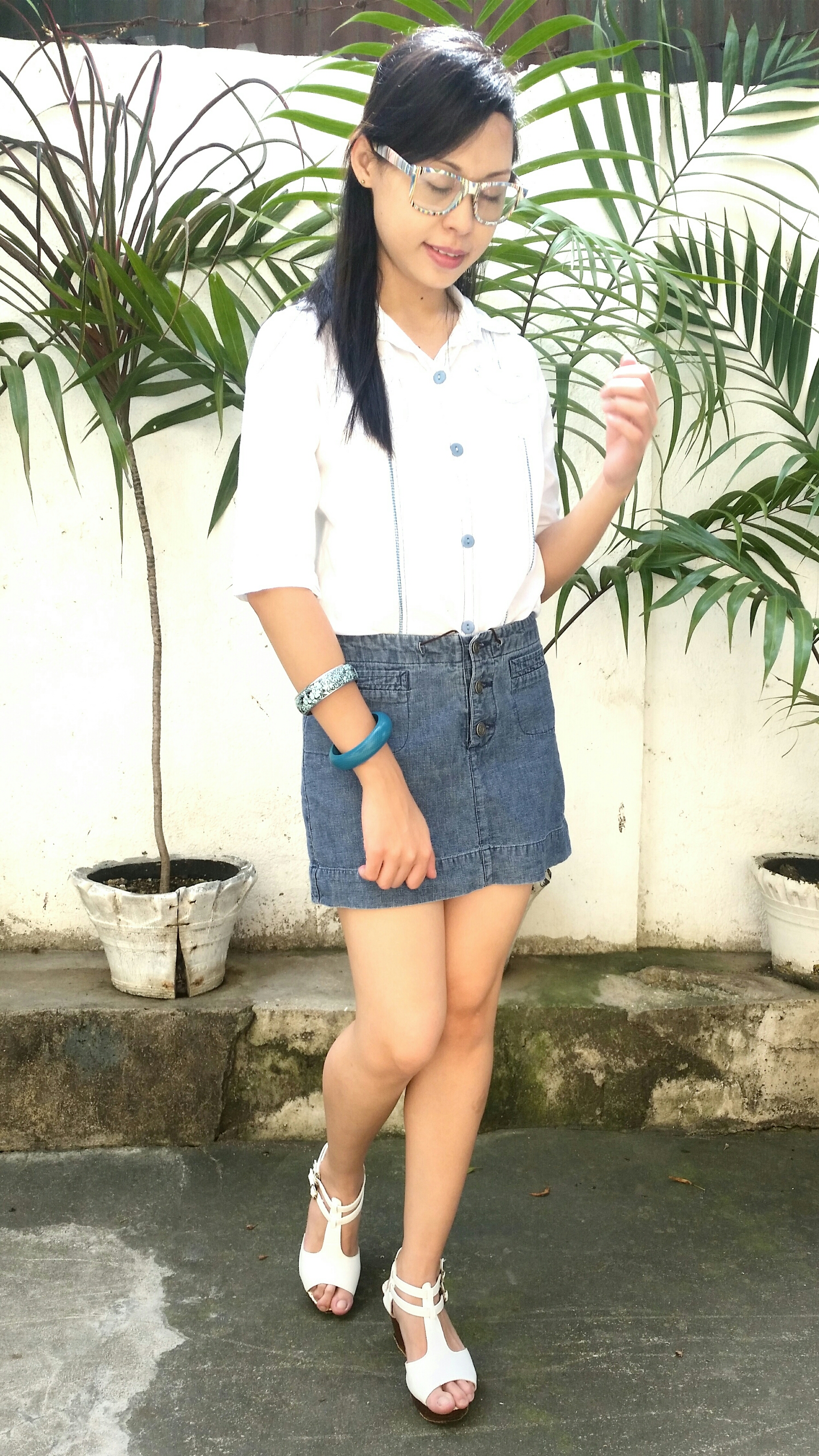 I wanted to keep things casual, comfy and classic, so I paired the skirt with a white button down with hints of blue. Finished the look up with my white wedges and blue eyeglasses. What do you think?