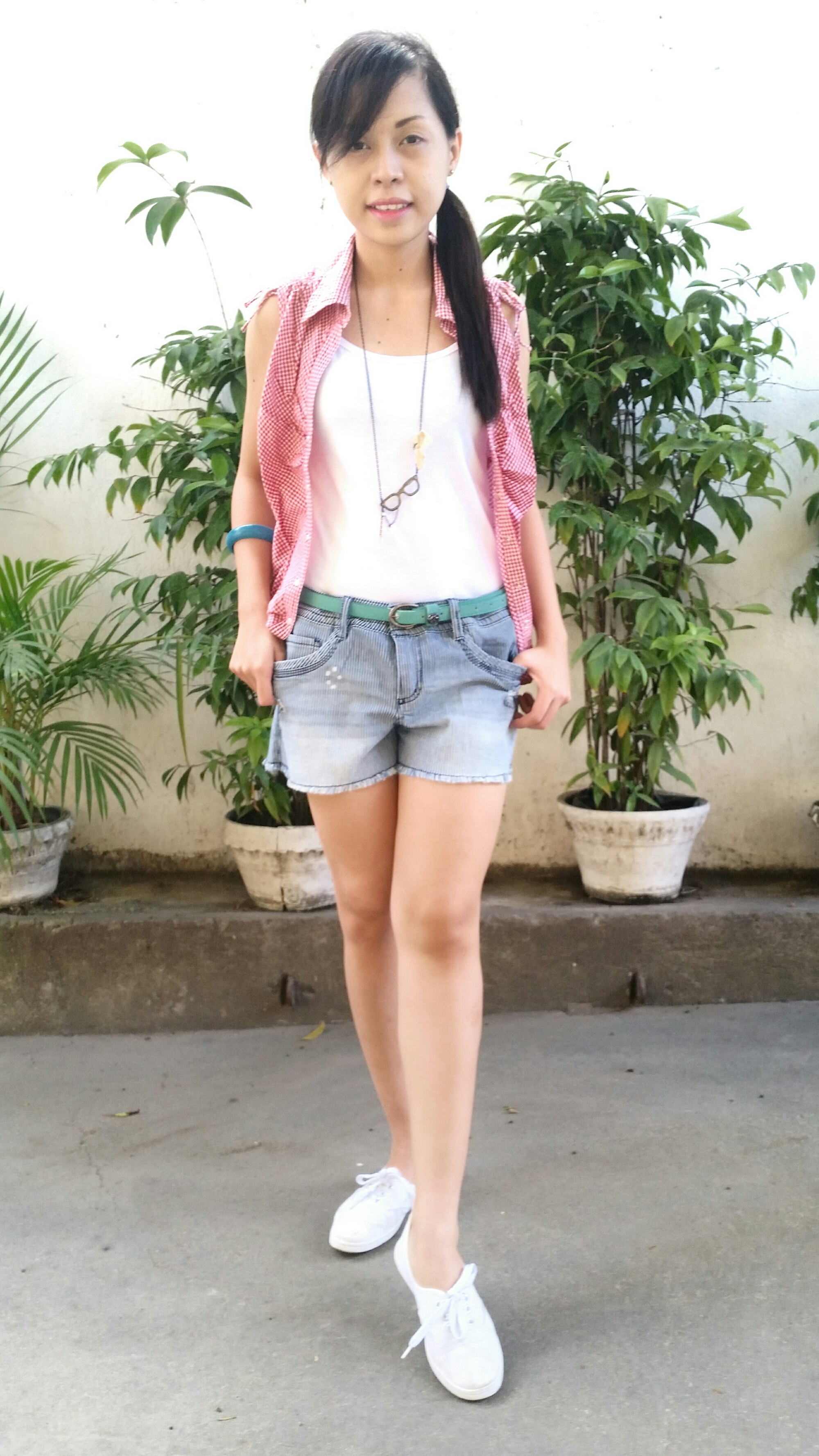 For a hot November day, I opted to wear something light with one of my favorite style equations! Stripes + Plaid! I wore this red plaid top from Faded Glory as a vest with a white tank top underneath and completed the equation with these striped L.e.i. ripped denim shorts. It was a terribly hot day so I tied my hair to the side and finished it off with white sneakers. What do you think?