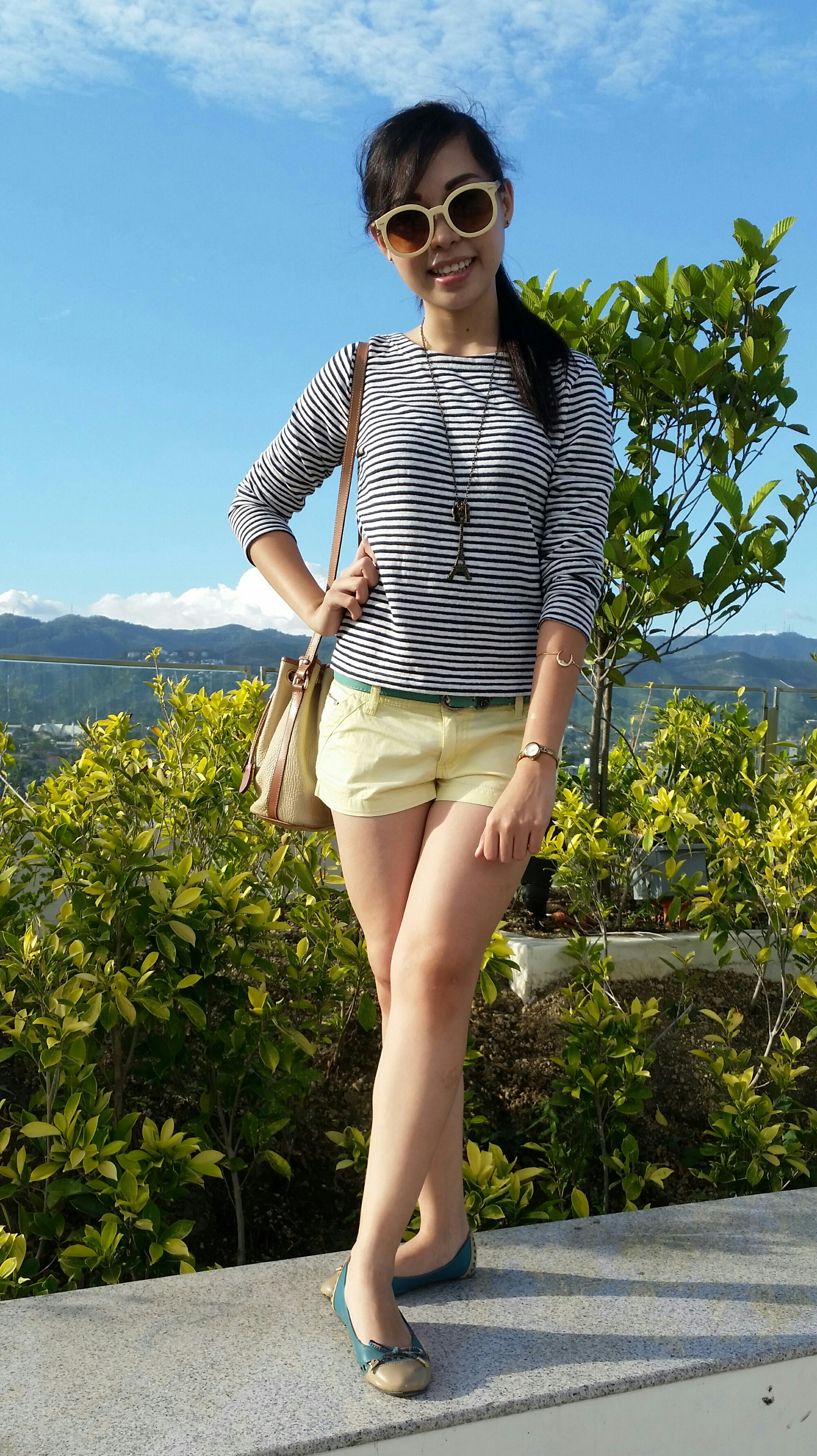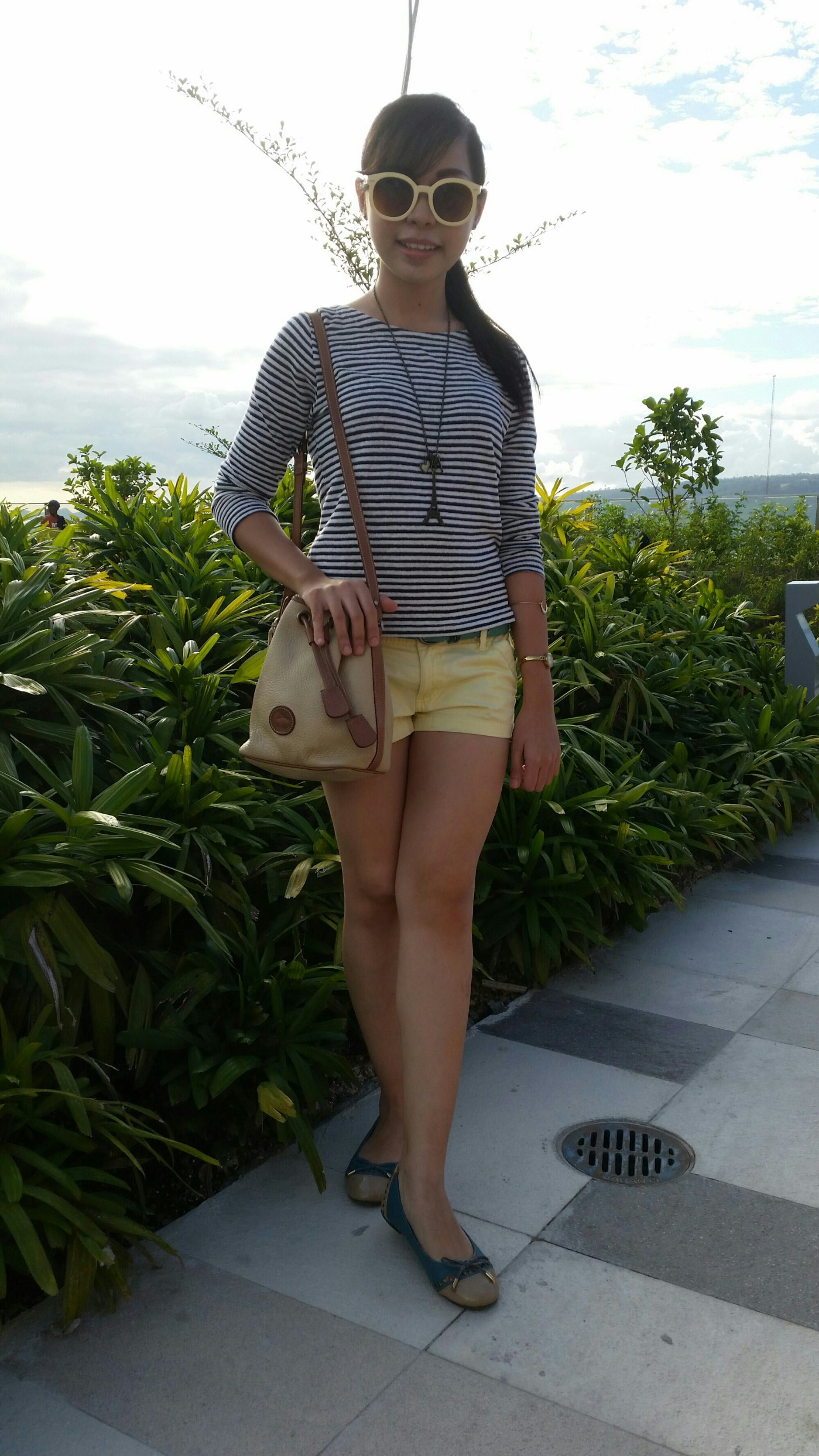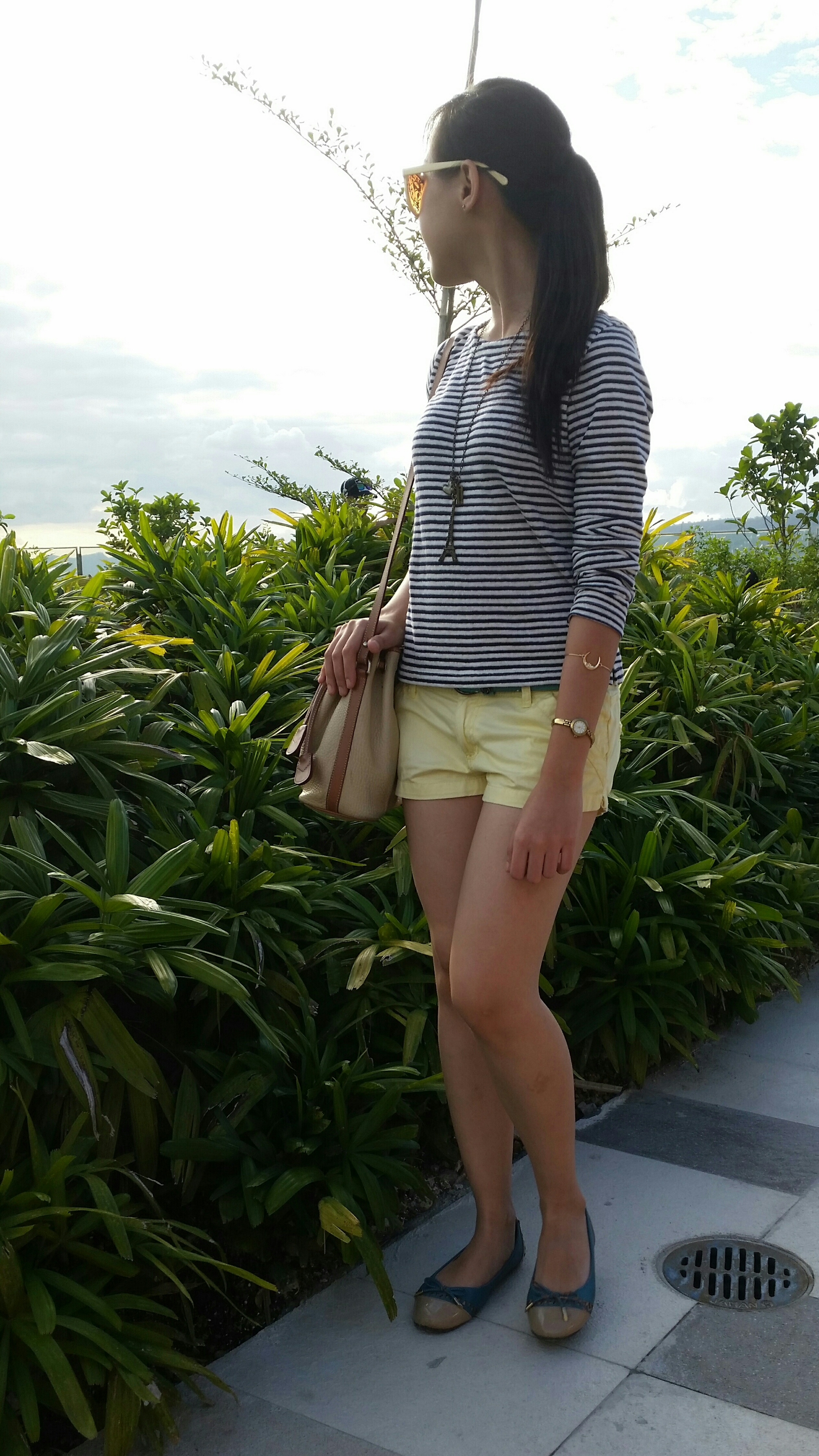 So for a day out for a walk with the fam, I am in a cute style equation! Stripes + Pastel! I wore this black and white stripes top from Calvin Klein and I paired this with a cute pastel yellow shorts. This is definitely a year for pastel colors! I brought my sunnies with me and my bucket bag. I finished the look with a pair of blue ballet shoes.