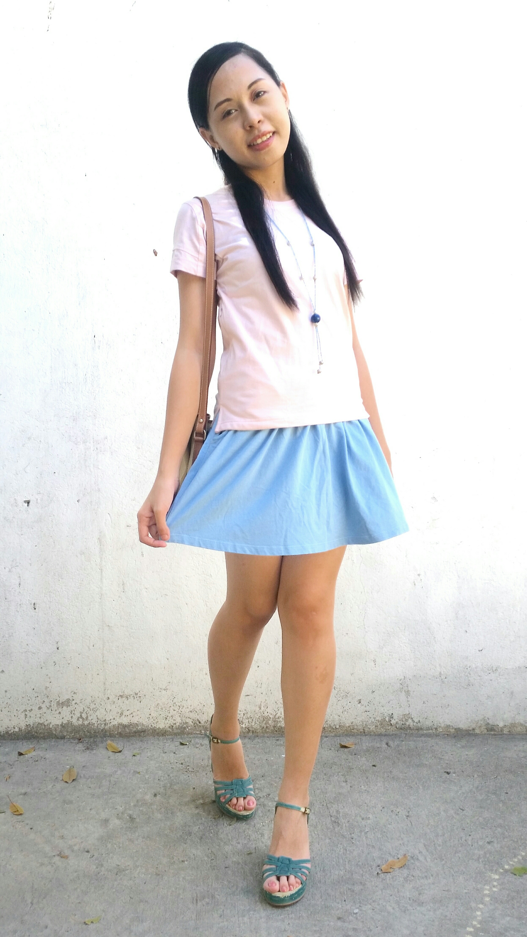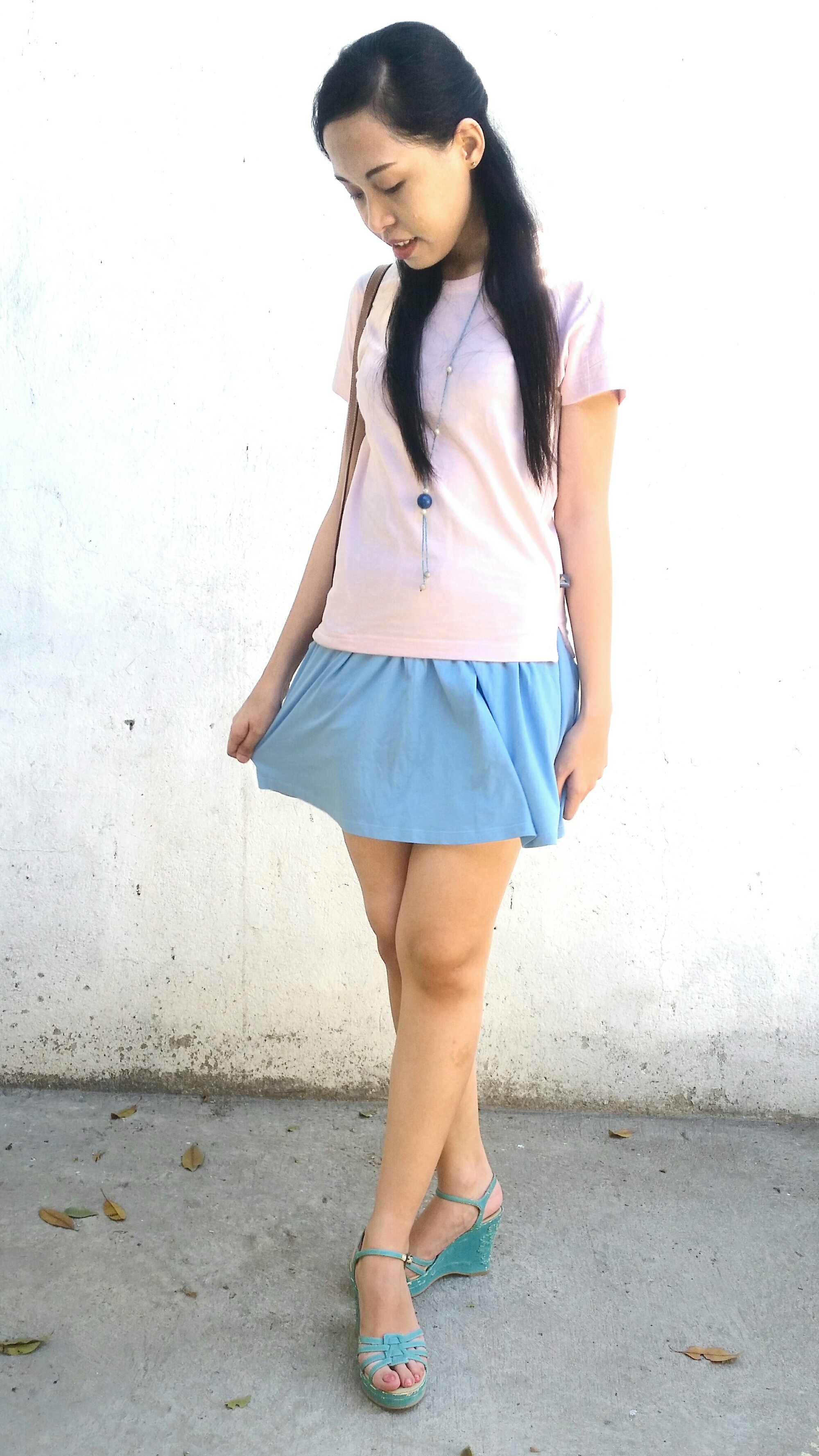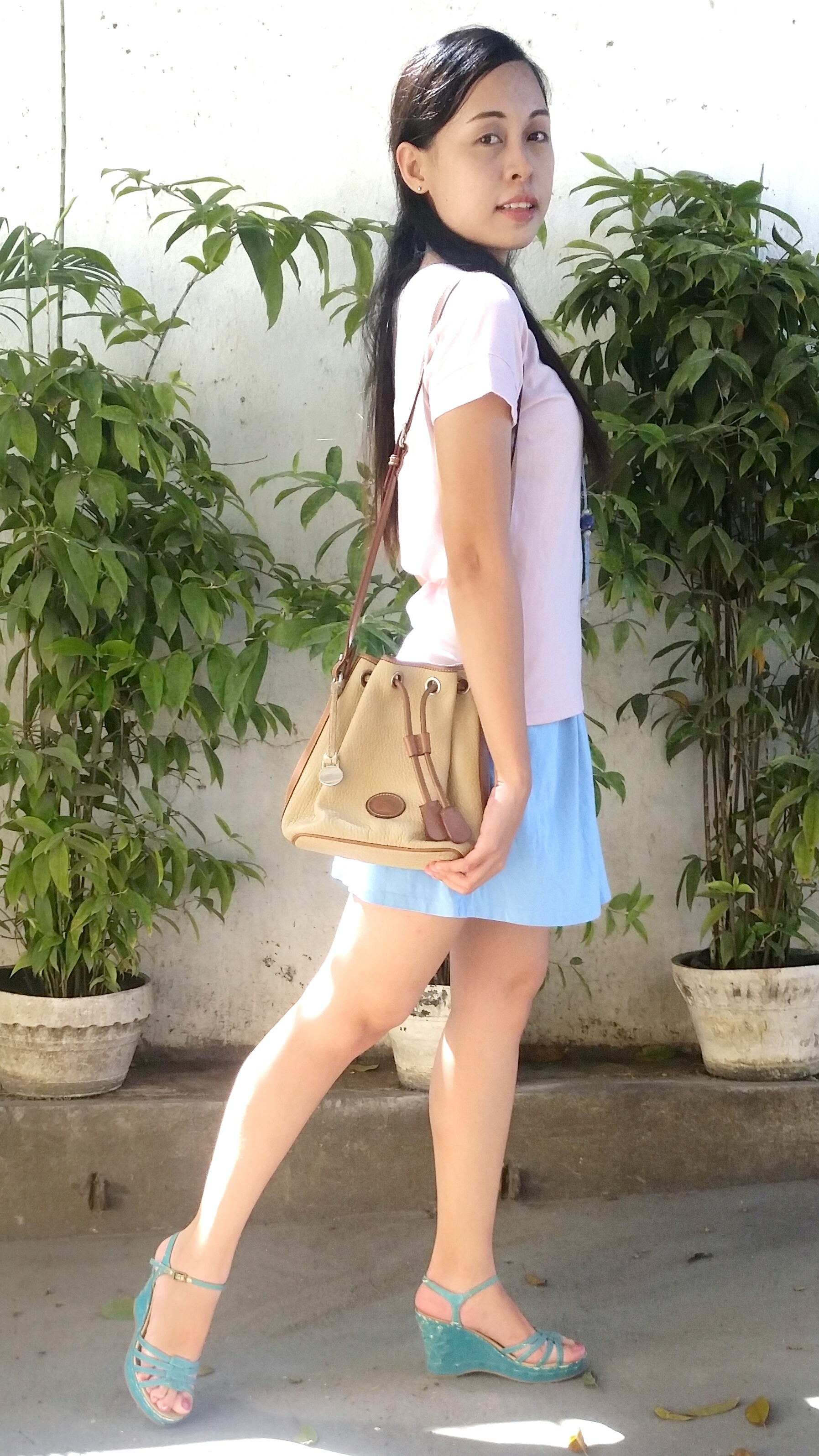 To say hello to May, I wanted to try out this trend as well while dressing lightly too. I wore this plain rose quartz tee and paired it with a serenity skater skirt on a really hot day out with the sisters. I kept my hair in a half ponytail. I accessorized with this blue long necklace, brought this bucket bag and finished everything off with this pair of aquamarine wedges.