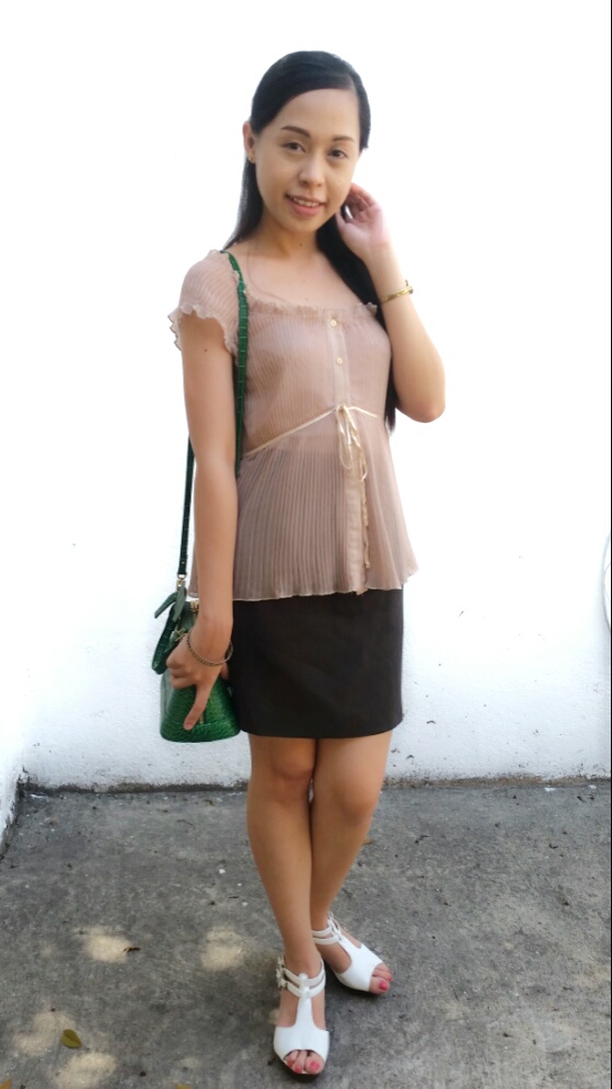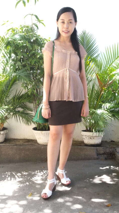My sister wasn’t that easy to please with my choices then I found these pieces! I really like this beige dainty top. It’s pretty with all the pleats and can be worn formally for work and also on special occasions as well. I paired it with an olive green pencil skirt (though it looks brown on some of the photos, it’s really olive green) which I think is just work appropriate. I finished it off with a pair of white wedges and spiced things up a little by accessorizing with this green shoulder bag. She was pretty happy with how this outfit turned out to be!