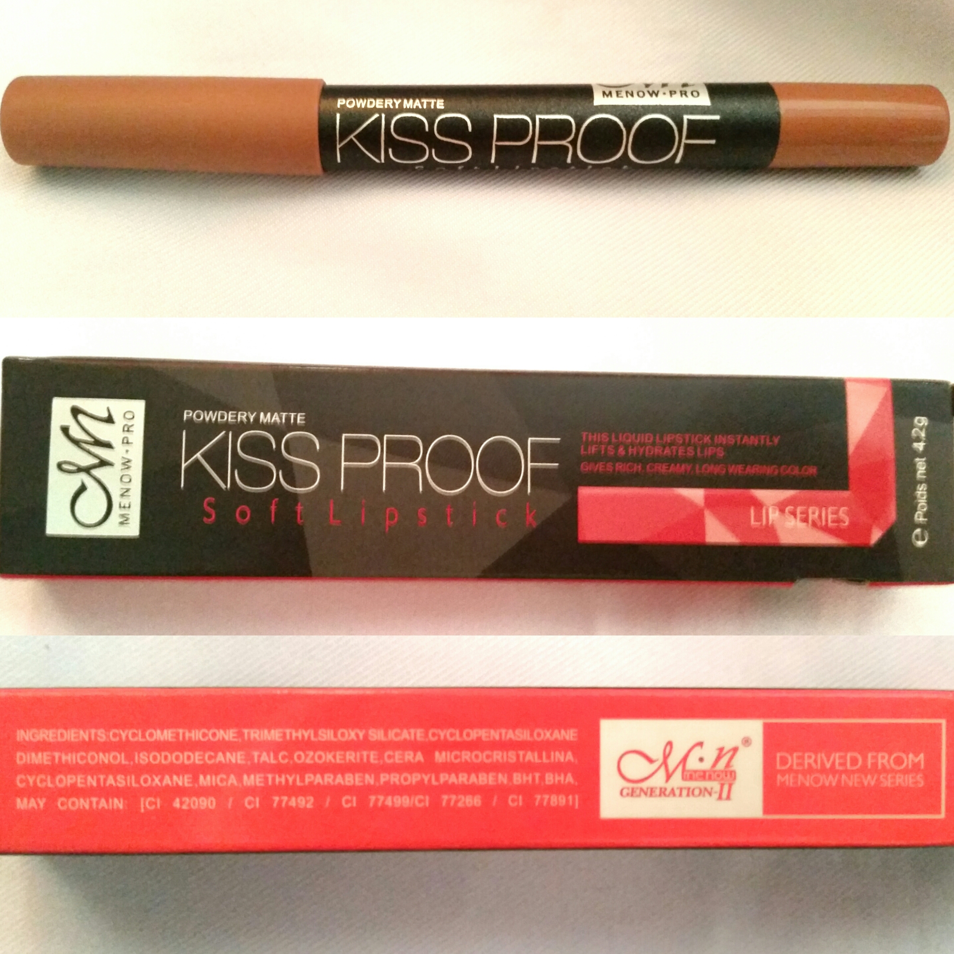 Product description: MeNow Kissproof Soft Lipstick is a long lasting, kiss proof lipstick that lifts and hydrates lips.