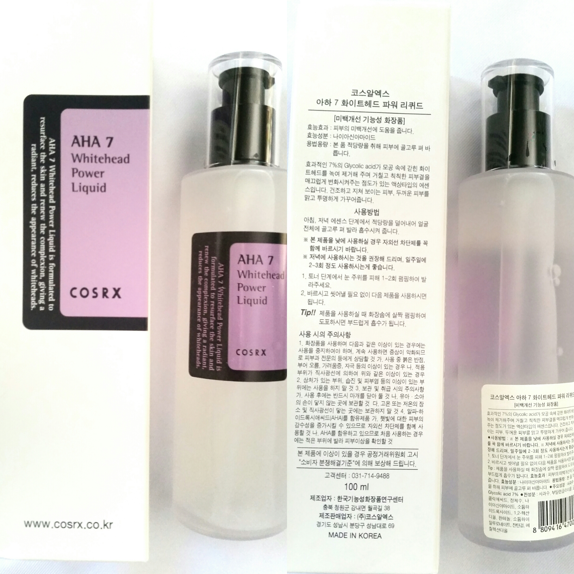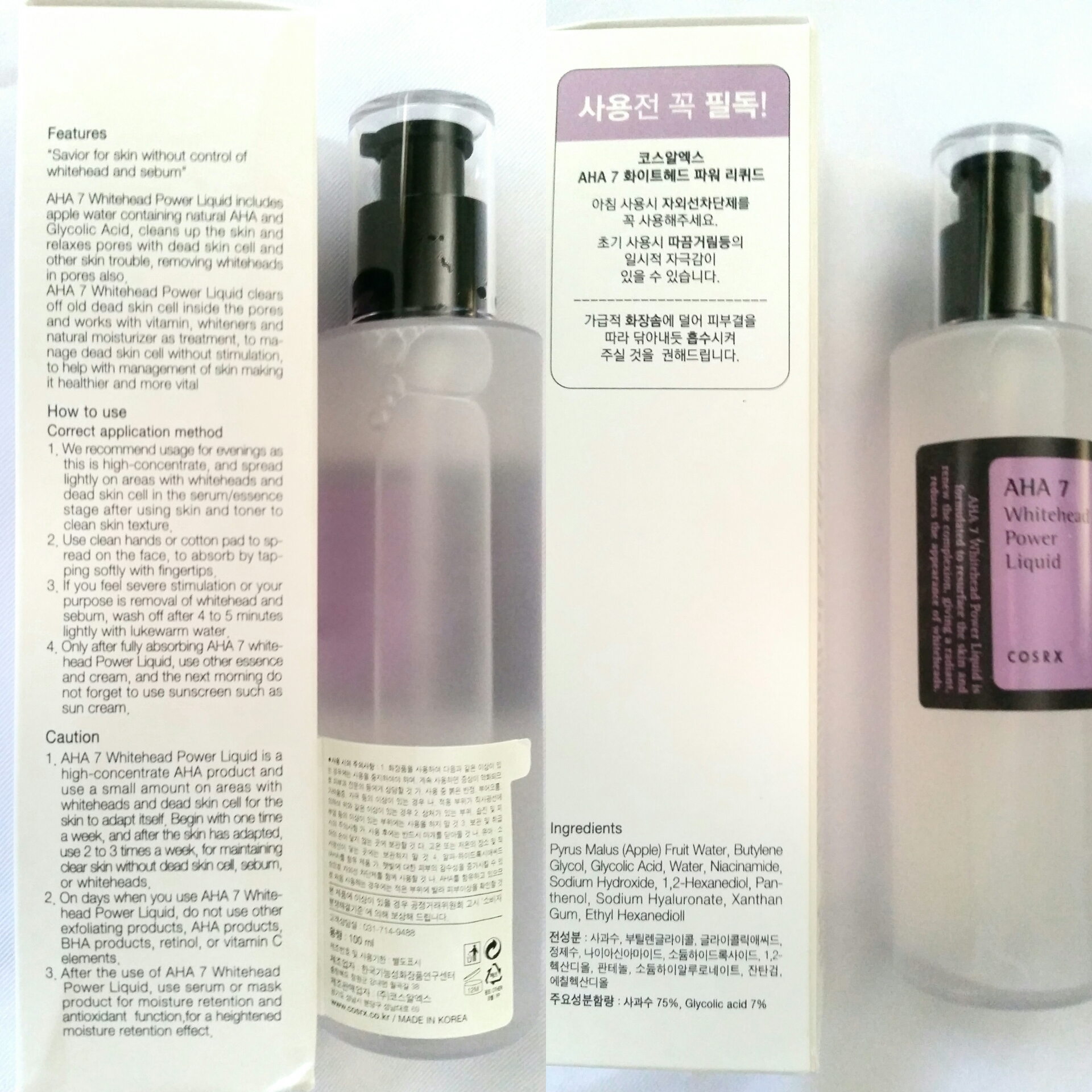 Ingredients: The COSRX AHA 7 Whitehead Power Liquid contains only 10 ingredients which includes Apple Water containing natural AHA and Glycolic Acid, which cleans up the skin and relaxes pores from dead skin cells and other skin troubles. Apple Water also has exfoliating factors but is still gentle enough not to irritate sensitive skin while reducing the appearance of fine lines, sun damage and hyper pigmentation while diminishing pore size. (Full list of ingredients in a photo below)