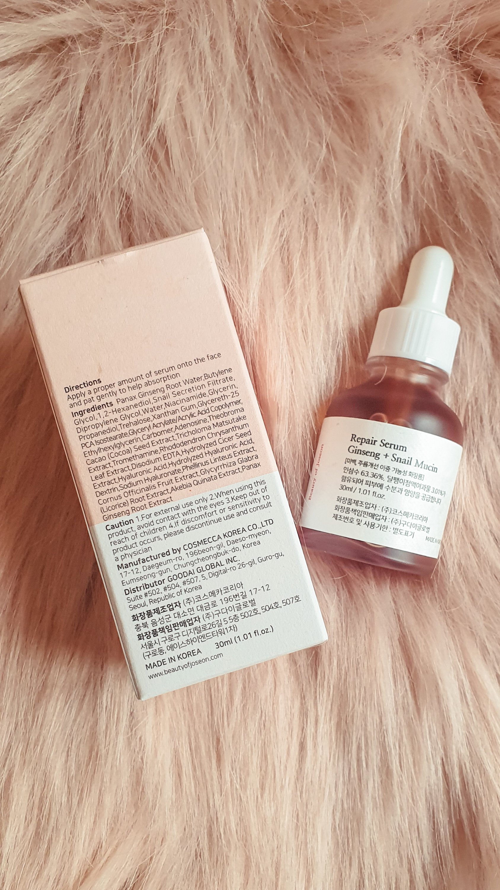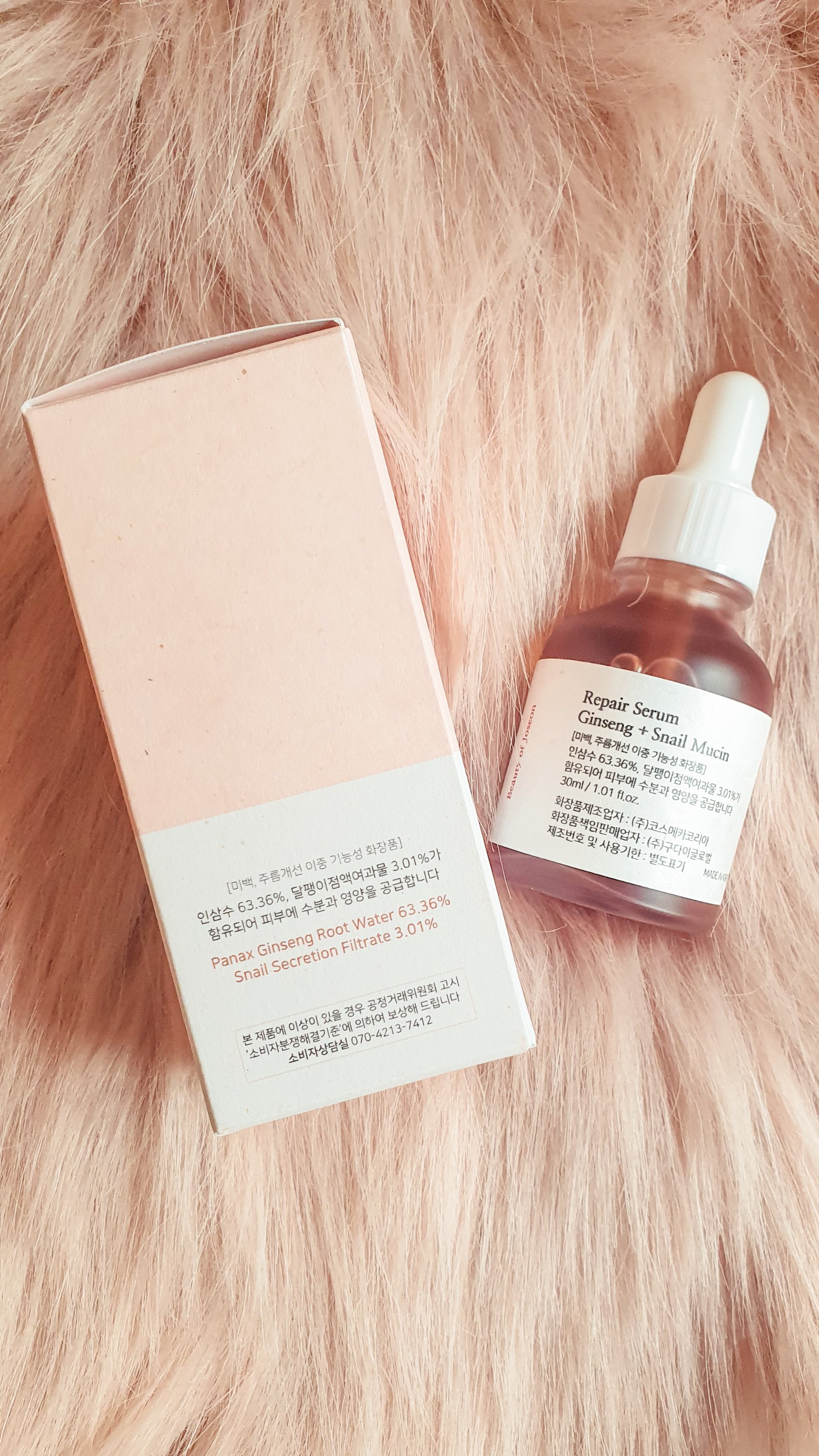 The Beauty of Joseon Repair Serum is a lightweight brown but nourishing serum helpful against aging and pigmentation with 63.36% of Ginseng water root & 3% snail mucin. Ginseng is great for anti-wrinkle and pigmentation while, snail mucin is a key ingredient for repairing scars and improving skin elasticity.