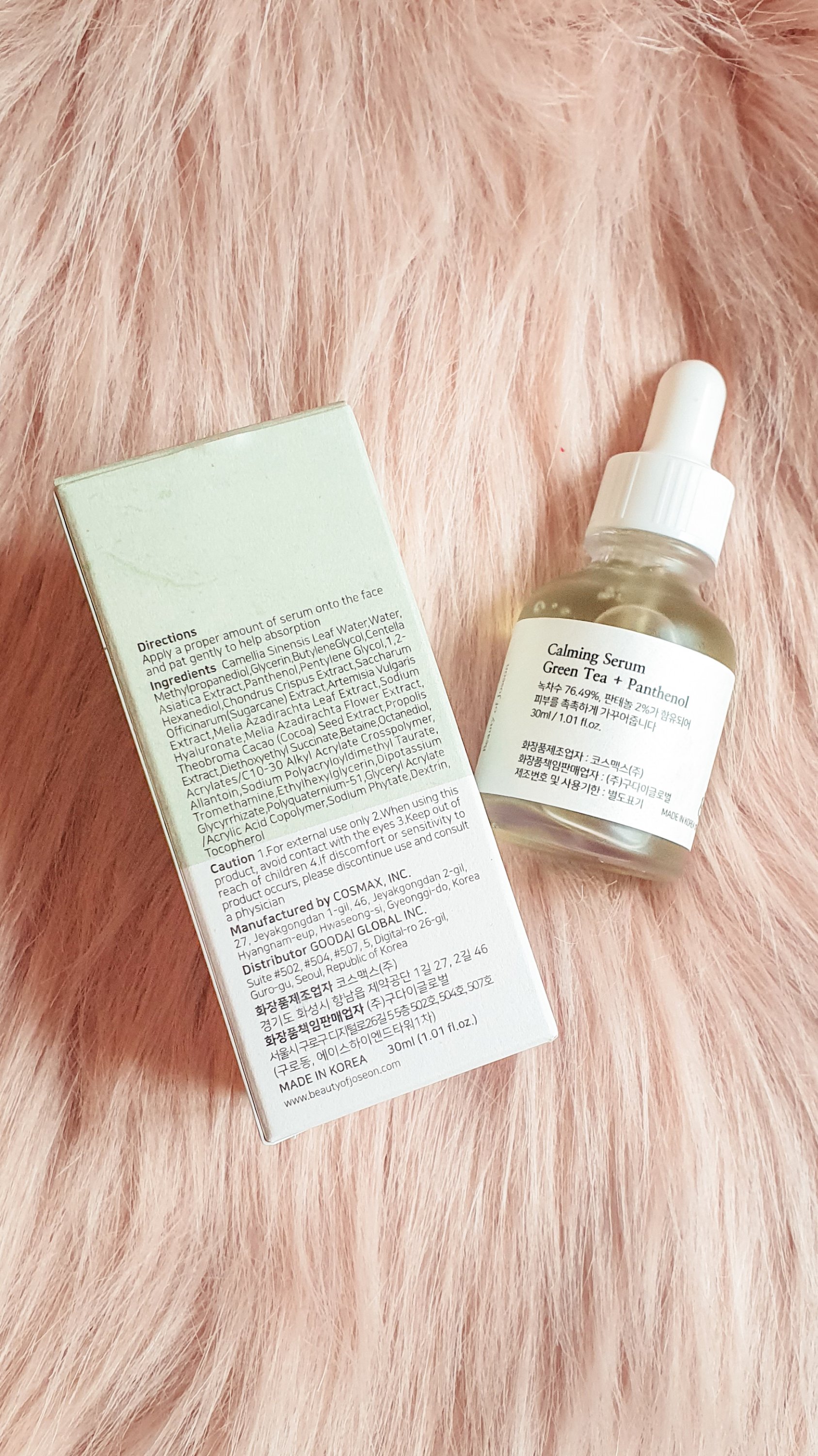 The Beauty of Joseon Calming Serum is a green-tinted serum boosted with naturally-derived calming and moisturizng ingredients. It is made with 76.49% of Green tea leaf water and 2% Panthenol. Green tea is known for soothing and anti-wrinkle. With large amounts of Vitamin C in Green Tea, it greatly aids in skin brightening.