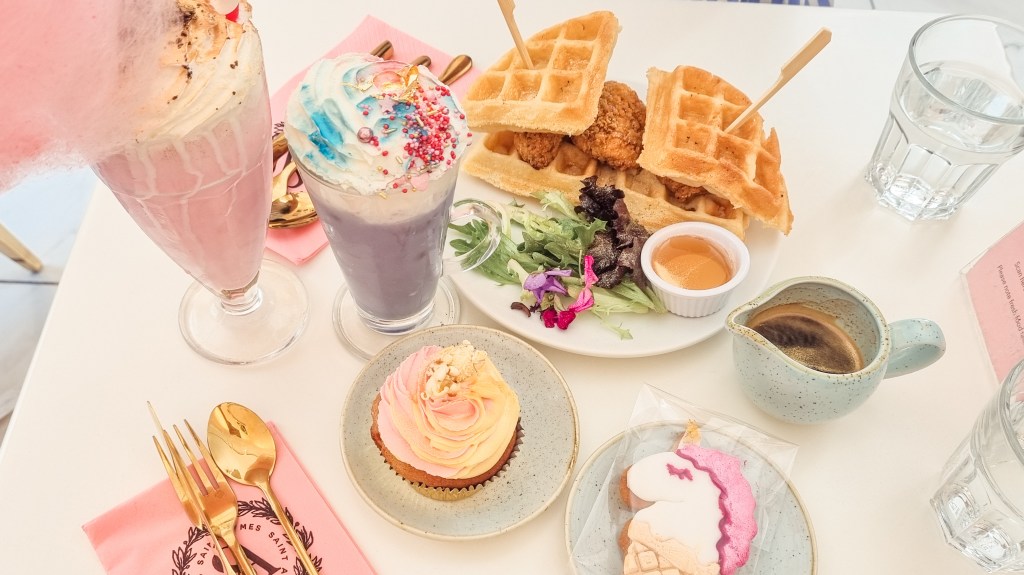 Saint Aymes’ menu is pretty wide, offering a variety of not just their signature desserts and drinks, but also savoury meals perfect for brunch. The sharing brunch on tea stand is a must try! But during my last visit, my friend and I just decided to get just a few of their must try menus. We got some Chicken and Waffle, one of their signature cupcakes and the cute Unicorn cookie. For drinks, we got a Unicorn Milkshake and a Unicorn Latte.