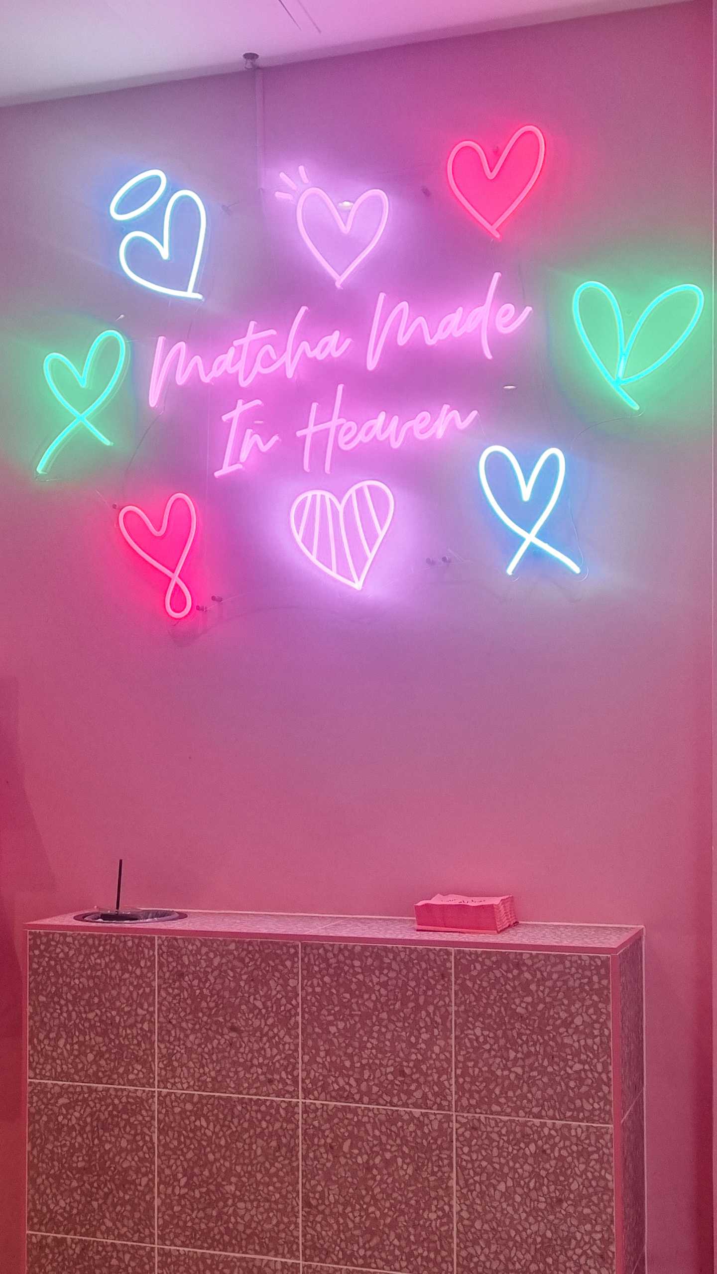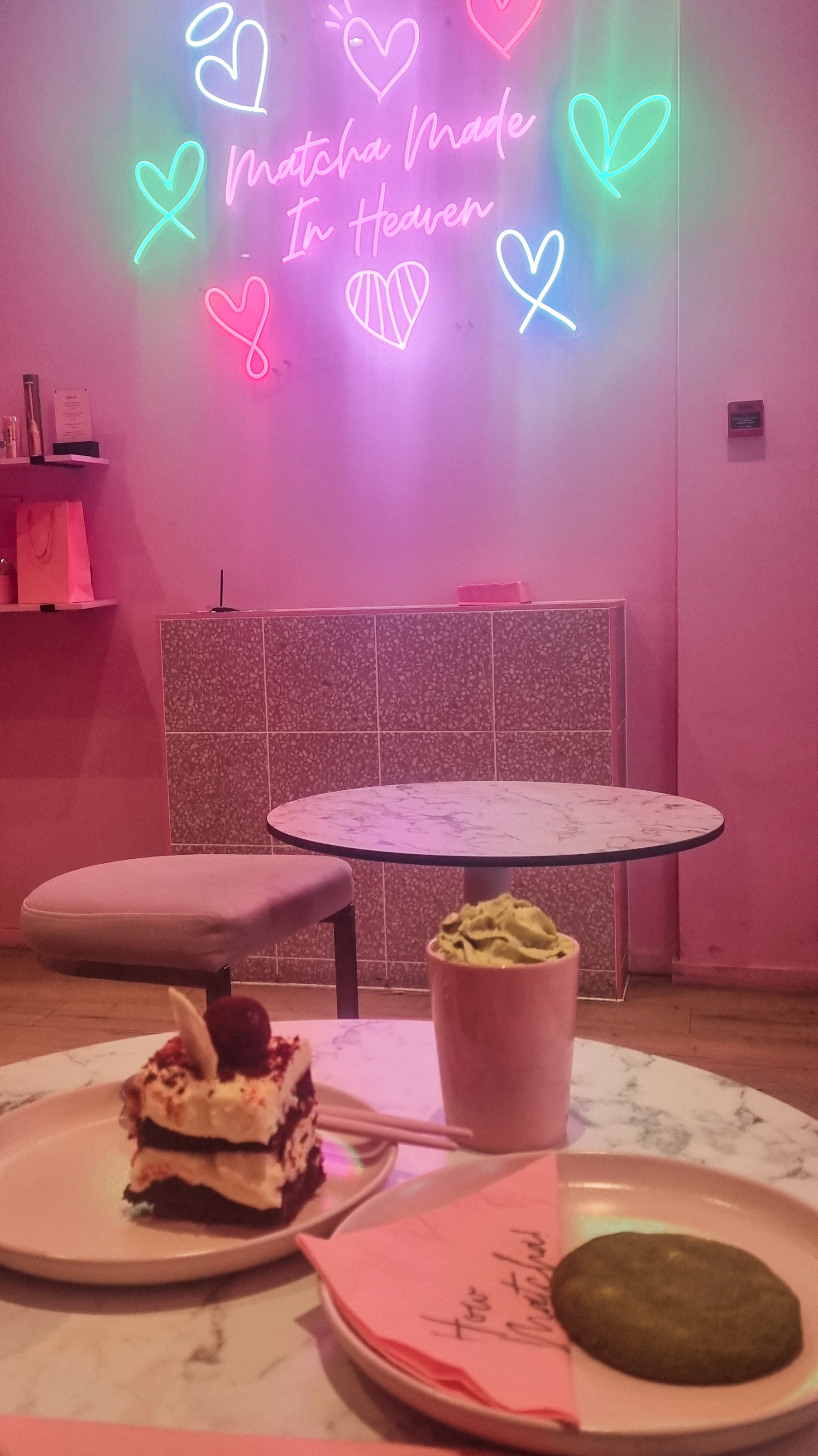 Of course, those cute neon lights are present for your instagrammable posts. My friend and I both had matcha lattes which were just the right mix, no bitterness at all but also not too sweet, making it really nice. We also got a piece of matcha cookie which I really liked and a slice of red velvet for a non-matcha option which had the right amount of sweetness. I would definitely go back to try their nutritional options fused with my favourite matcha which I thought was really unique.