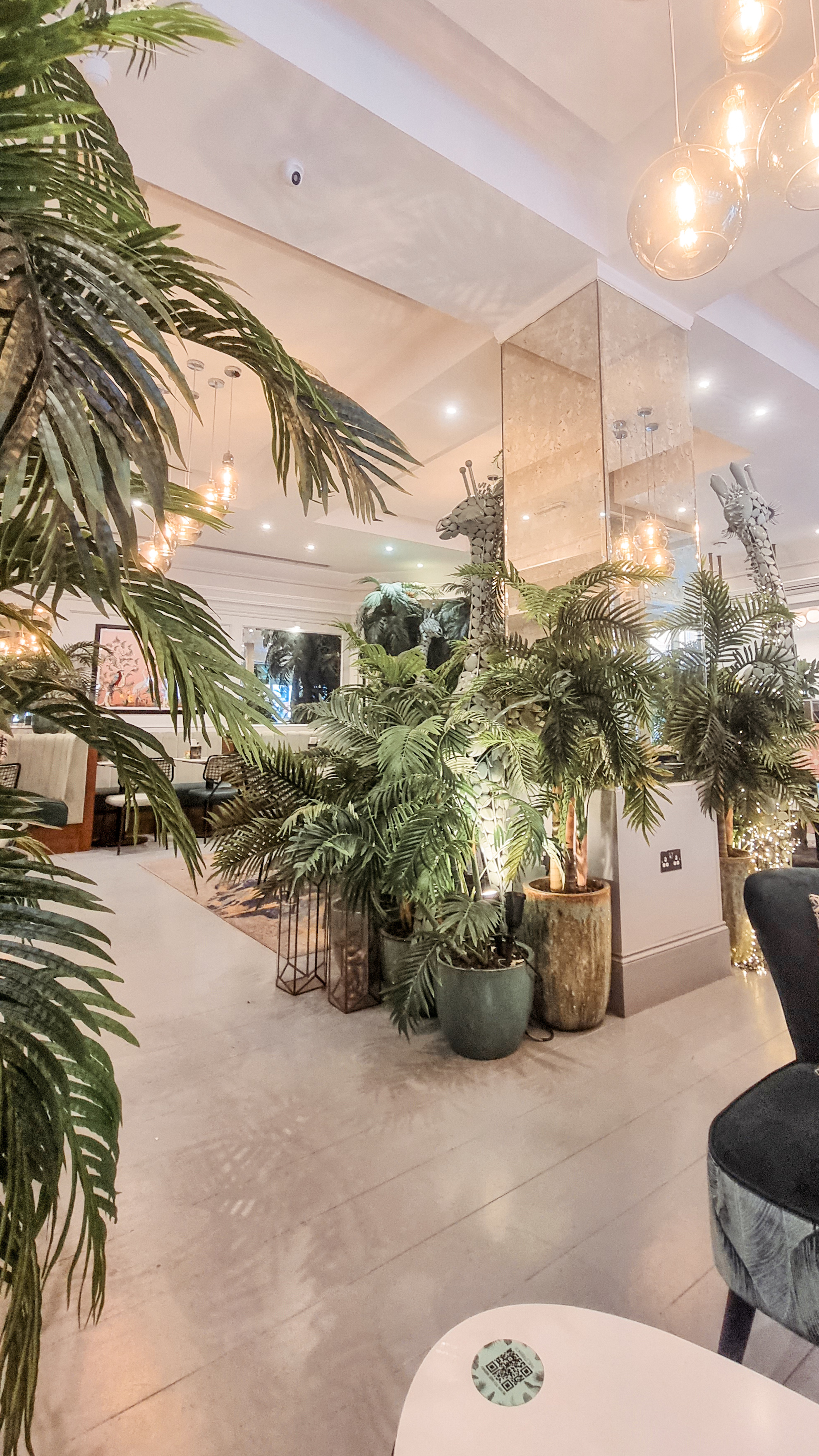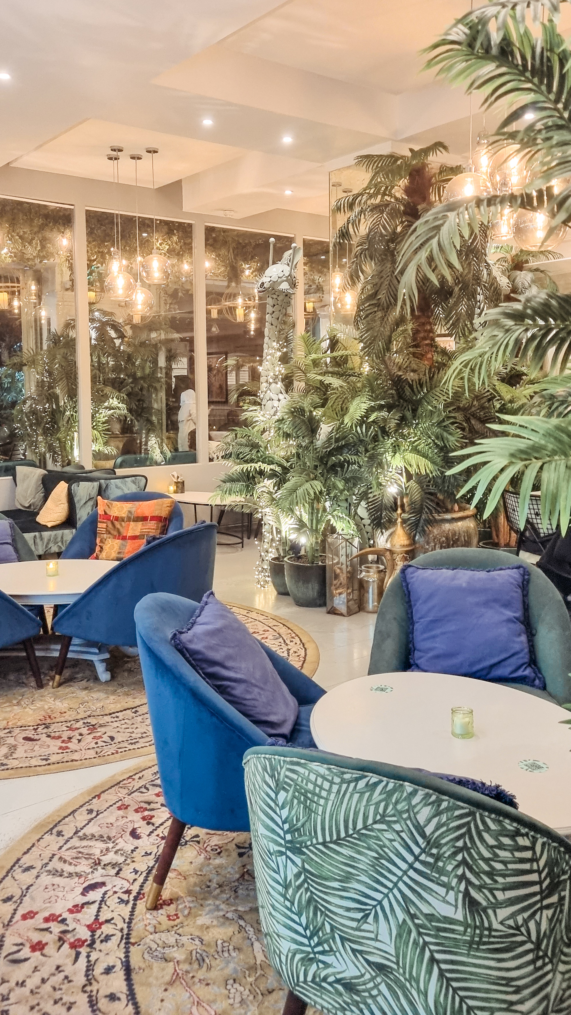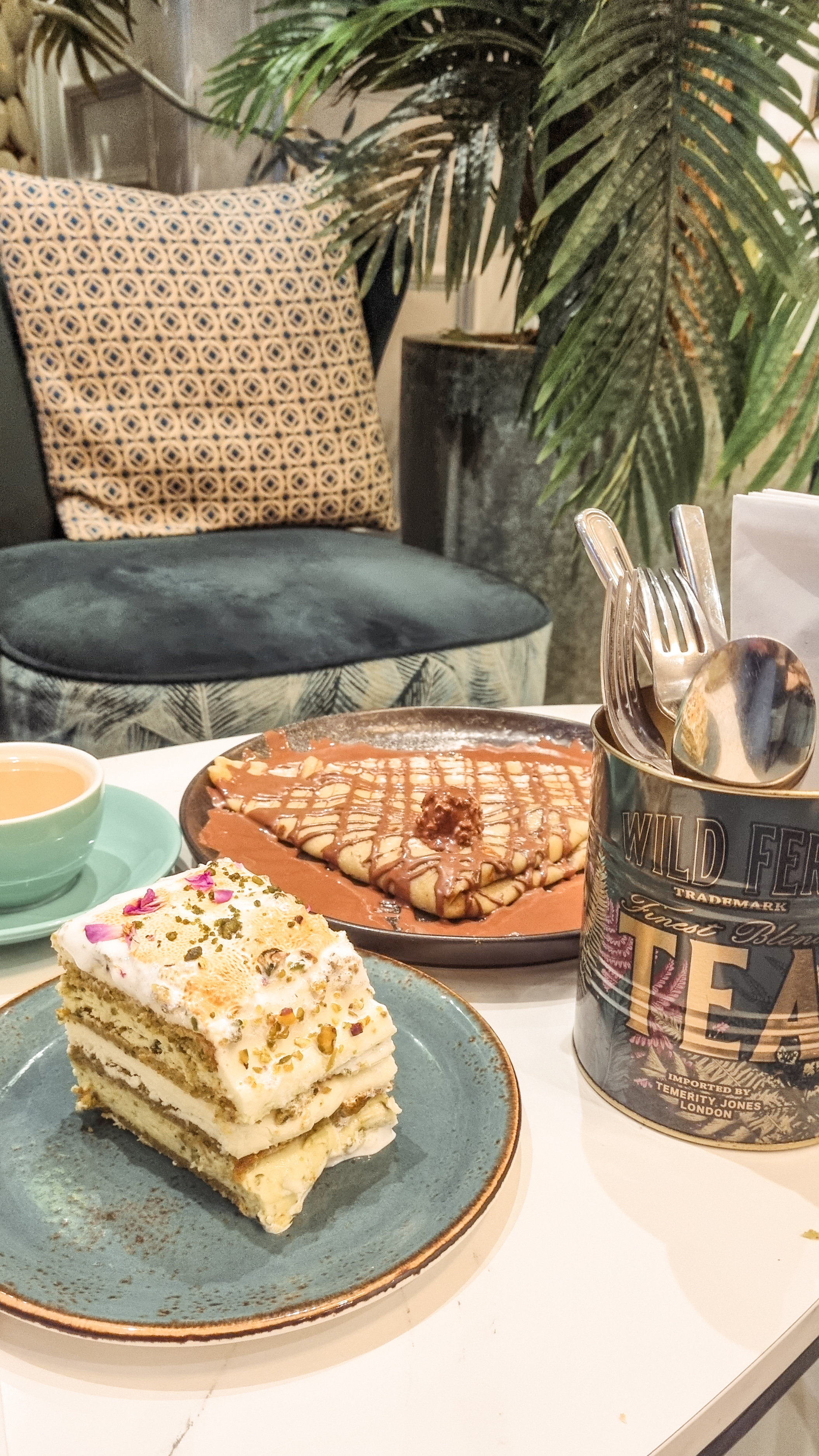 Starting with savouries, I and my friend got ourselves a mezze platter with halloumi fries, halloumi cheese, hummus and pita bread. The servings were just right and were very tasty. For drinks I got a pistachio latte which was really good while my friend got a regular latter. To finish with desserts, we got a pistachio cake, a ferrero crepe and some tea. I loved the crepe and the cake was nice as well. The service was good. Apart from being aesthetic, the greens and the giraffe surrounding me made me smile, it was really cozy. Also, they have a lot of seating.
