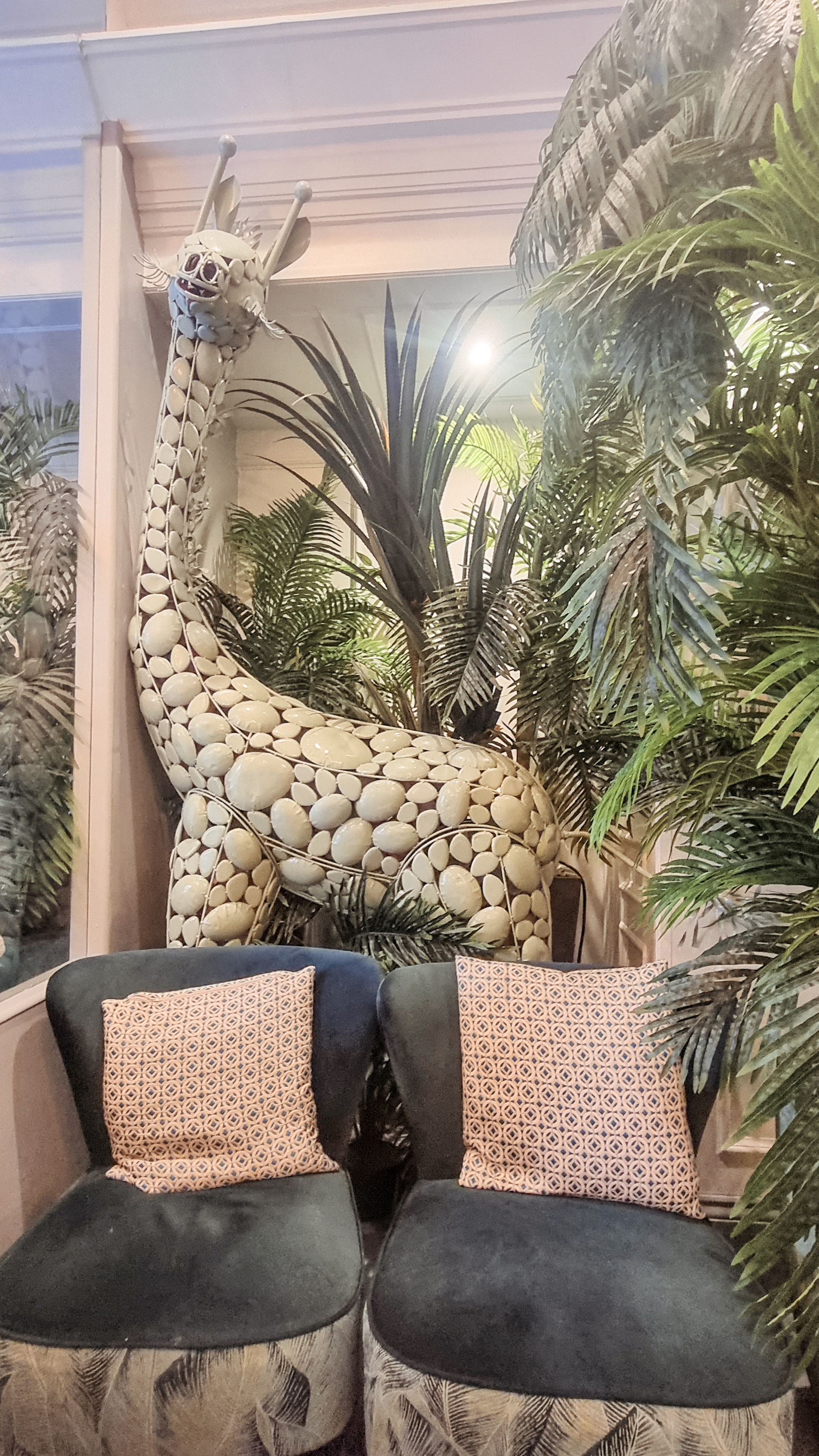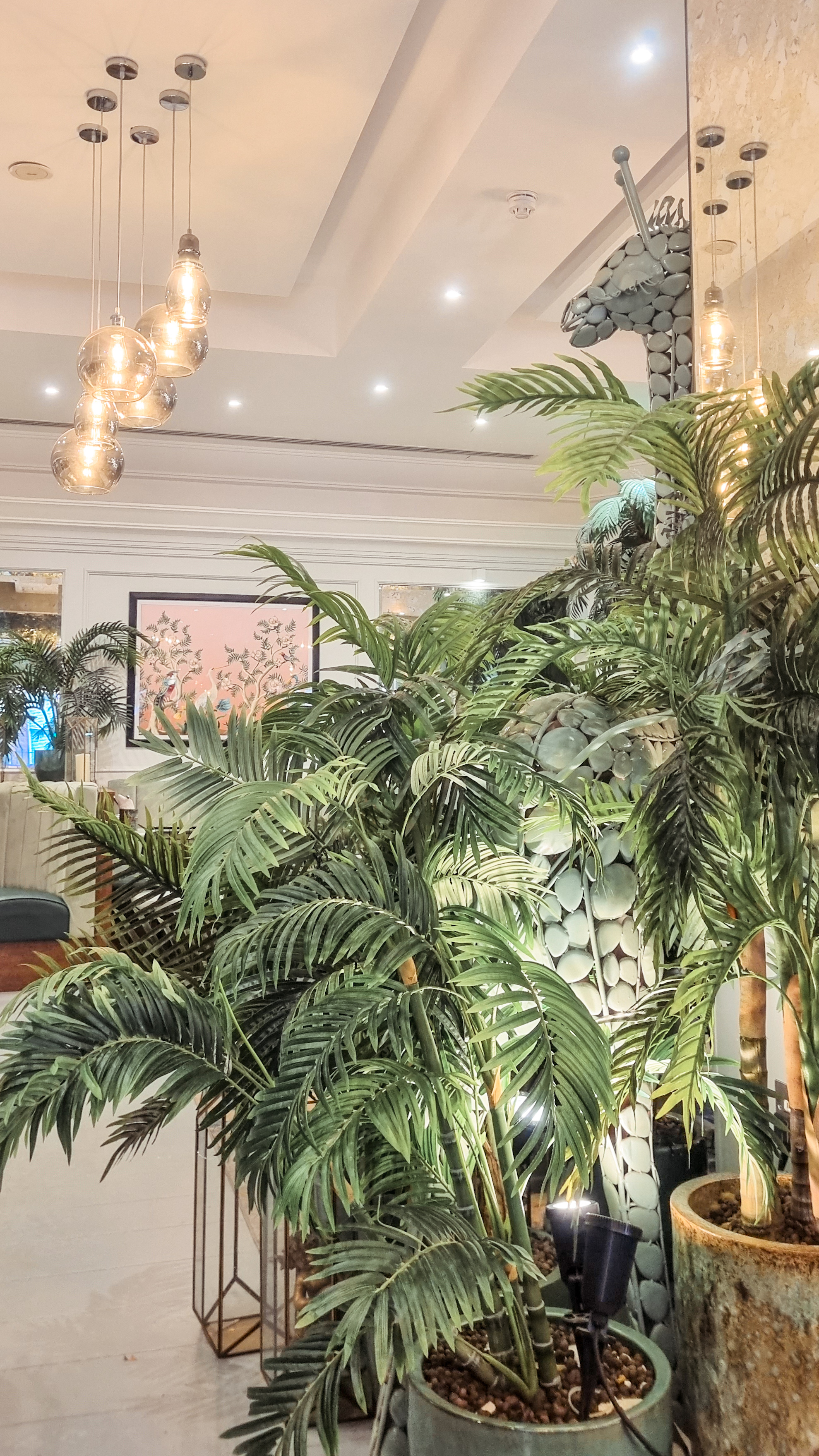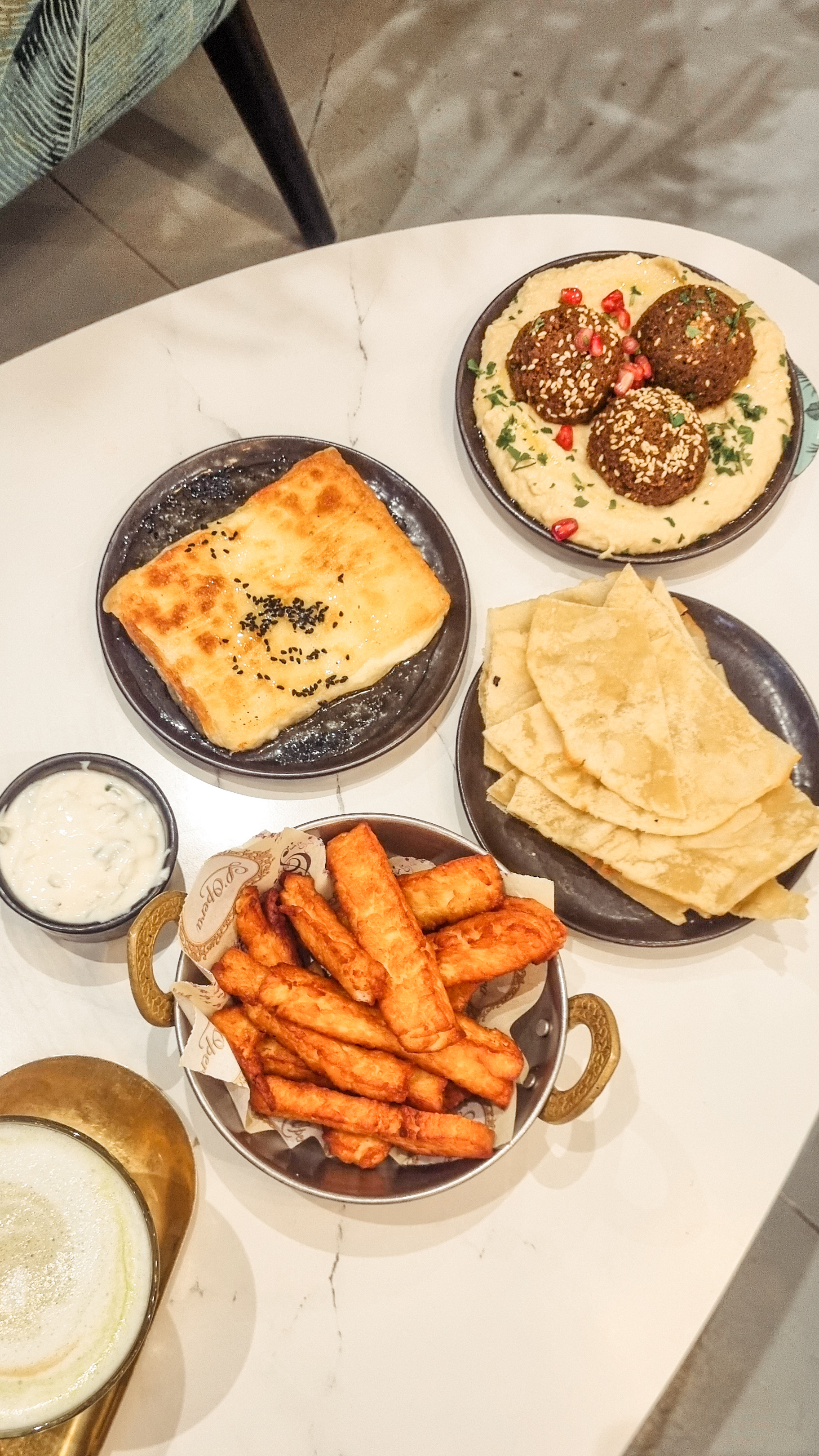 Starting with savouries, I and my friend got ourselves a mezze platter with halloumi fries, halloumi cheese, hummus and pita bread. The servings were just right and were very tasty. For drinks I got a pistachio latte which was really good while my friend got a regular latter. To finish with desserts, we got a pistachio cake, a ferrero crepe and some tea. I loved the crepe and the cake was nice as well. The service was good. Apart from being aesthetic, the greens and the giraffe surrounding me made me smile, it was really cozy. Also, they have a lot of seating.